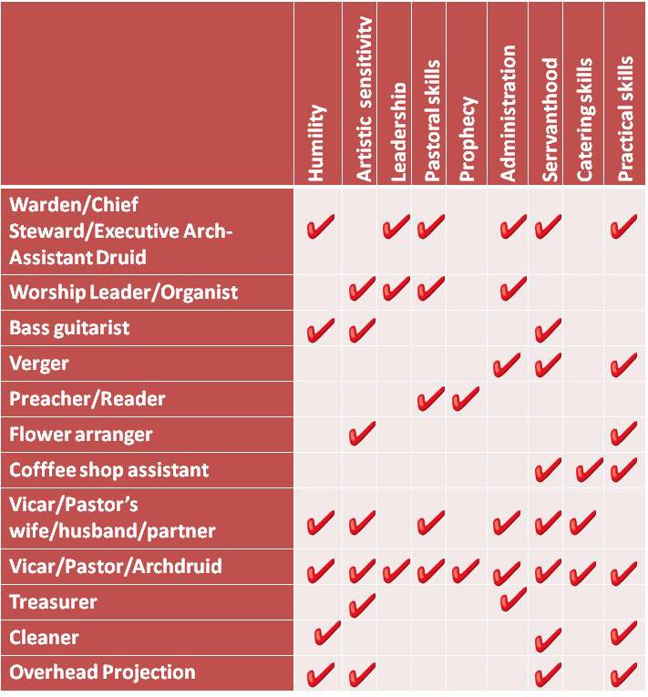 And then I listened to Bishop Pete and Vicky Beeching and they were talking about the gifts and attitudes necessary in a worship leader. And being an organisation kind of person, as you know, I realised that I could use this to help identify the right people for the right jobs. I attach my Gift Matrix - or "Charismatrix" in the original Greek - to help you, Dear Reader, with your discernment of the proper role for which you may be being called.